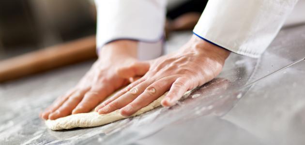- نضيف باقي كميّة الطحين بالتدريج ونبدأ عملية العجن حتى تتكون لدينا عجينة متماسكة وناعمة.