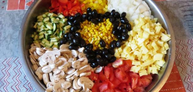 • حان الآن و قت وضع حلقات الزيتون الأسود الرائعة،تليها المشروم.